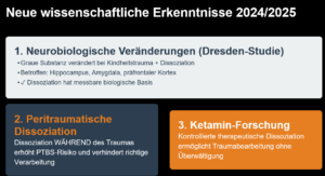 Aktuelle Forschung im Bereich neurobiologische Veränderung beim Trauma und bei DissoziationBildgebende Studien (Röntgen, Ultraschall, Computertomographie (CT) und Magnetresonanztomographie (MRT)) aus Dresden zeigen: Bei untersuchten Frauen, die ein Kindheitstraumata oder eine lange traumatische Zeit in Ihrer Kindheit durchlebt und überlebt haben und auch als erwachsene Person unter Dissoziation leiden, sind bestimmte / spezifische Bereiche der grauen Substanz im Gehirn verändert. Besonders betroffen hiervon sind: der Hippocampus, die Amygdala und Bereiche des präfrontalen Kortex. Diese Strukturen sind zentral verantwortlich für die Gedächtnisbildung, die Emotionsregulation und die Gefahrenbewertung einer Situation.